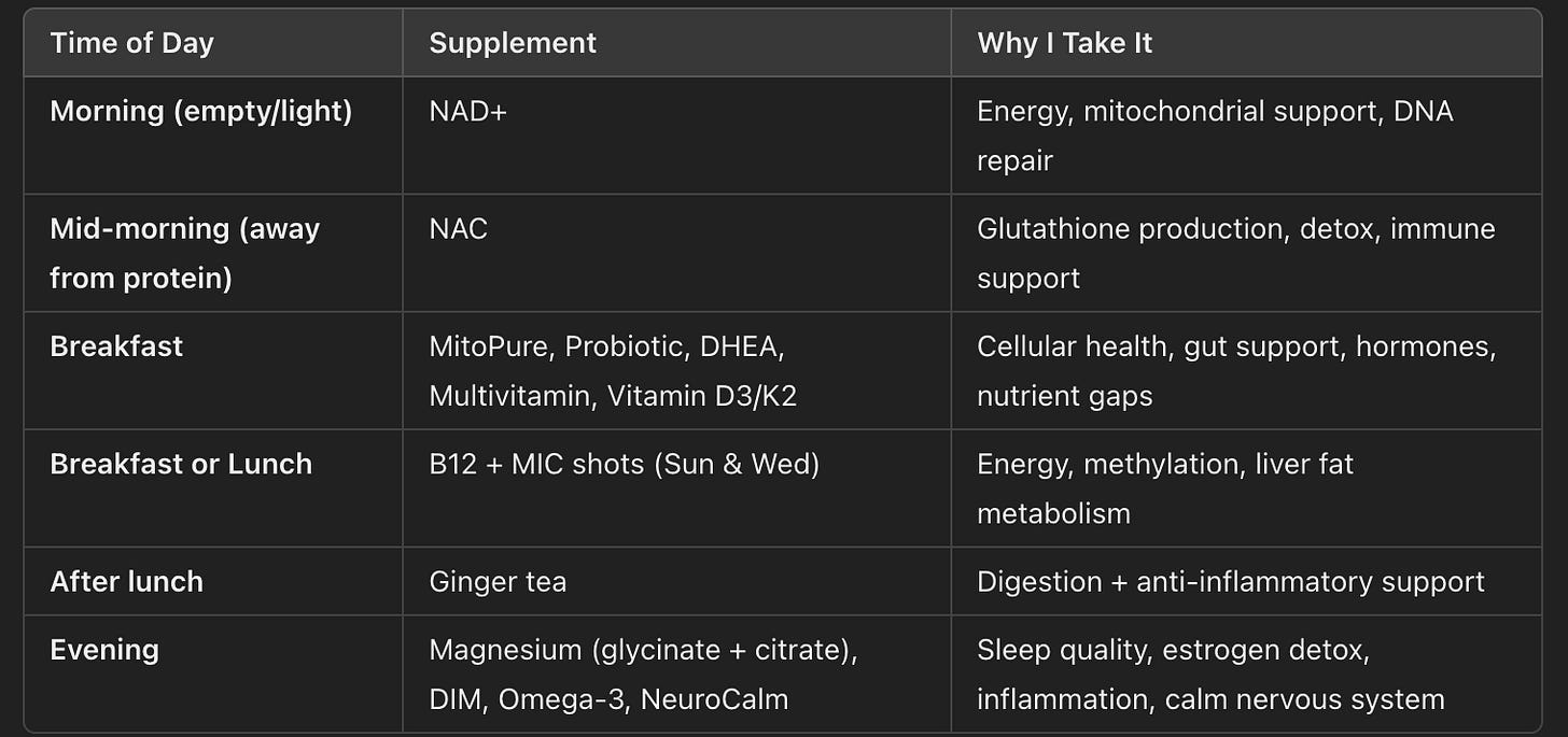 These three have become non-negotiables for me—especially in a season of life when mitochondrial function, detox pathways, and recovery matter more than ever.